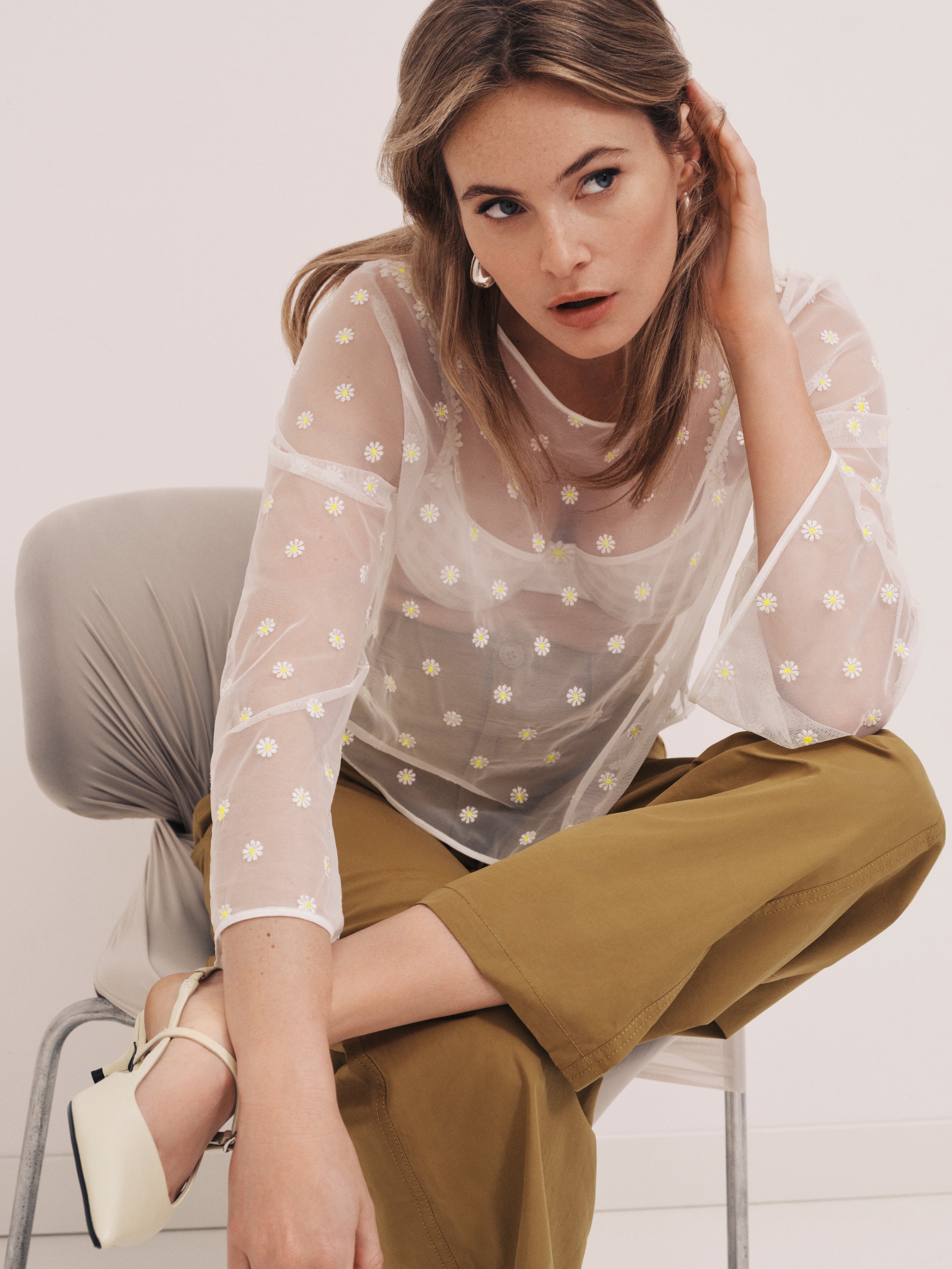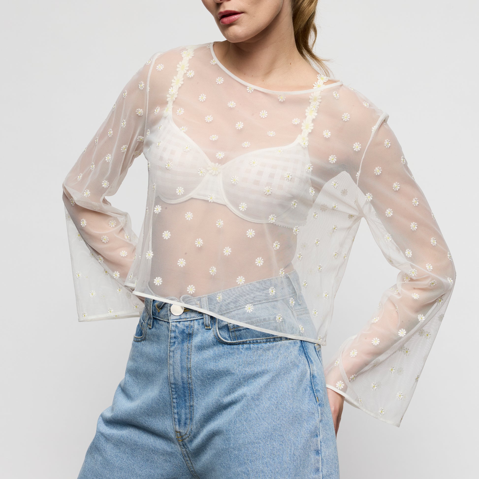 Signature emblématique de la série Avero, les marguerites brodées une à une sur ce caraco blanc transparent qui vient sublimer votre haut.
