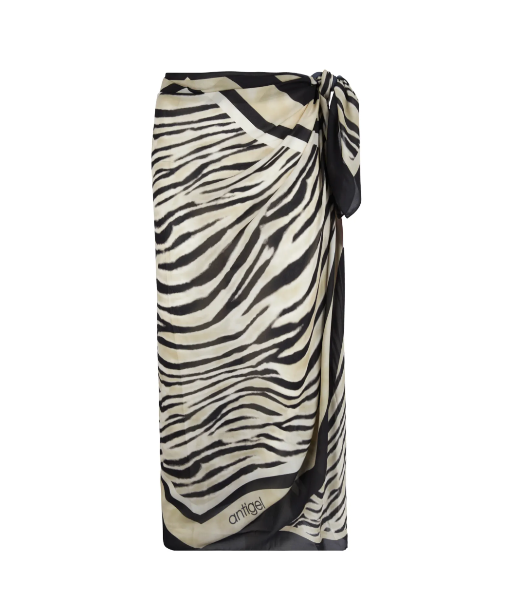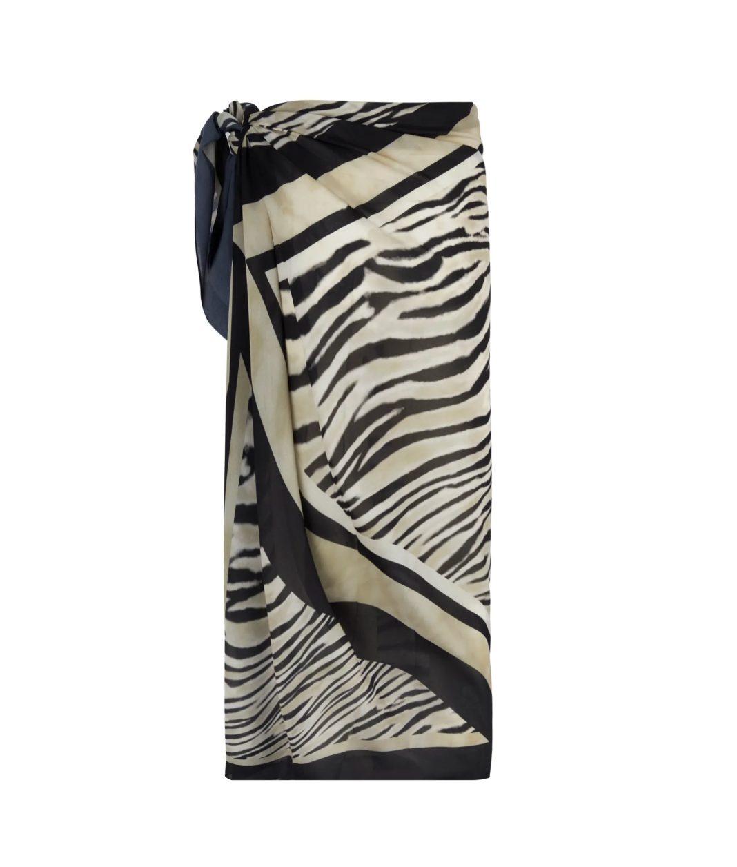 Le paréo La Tigre Blanc d’Antigel accompagne élégamment tous les maillots de bain de la série.