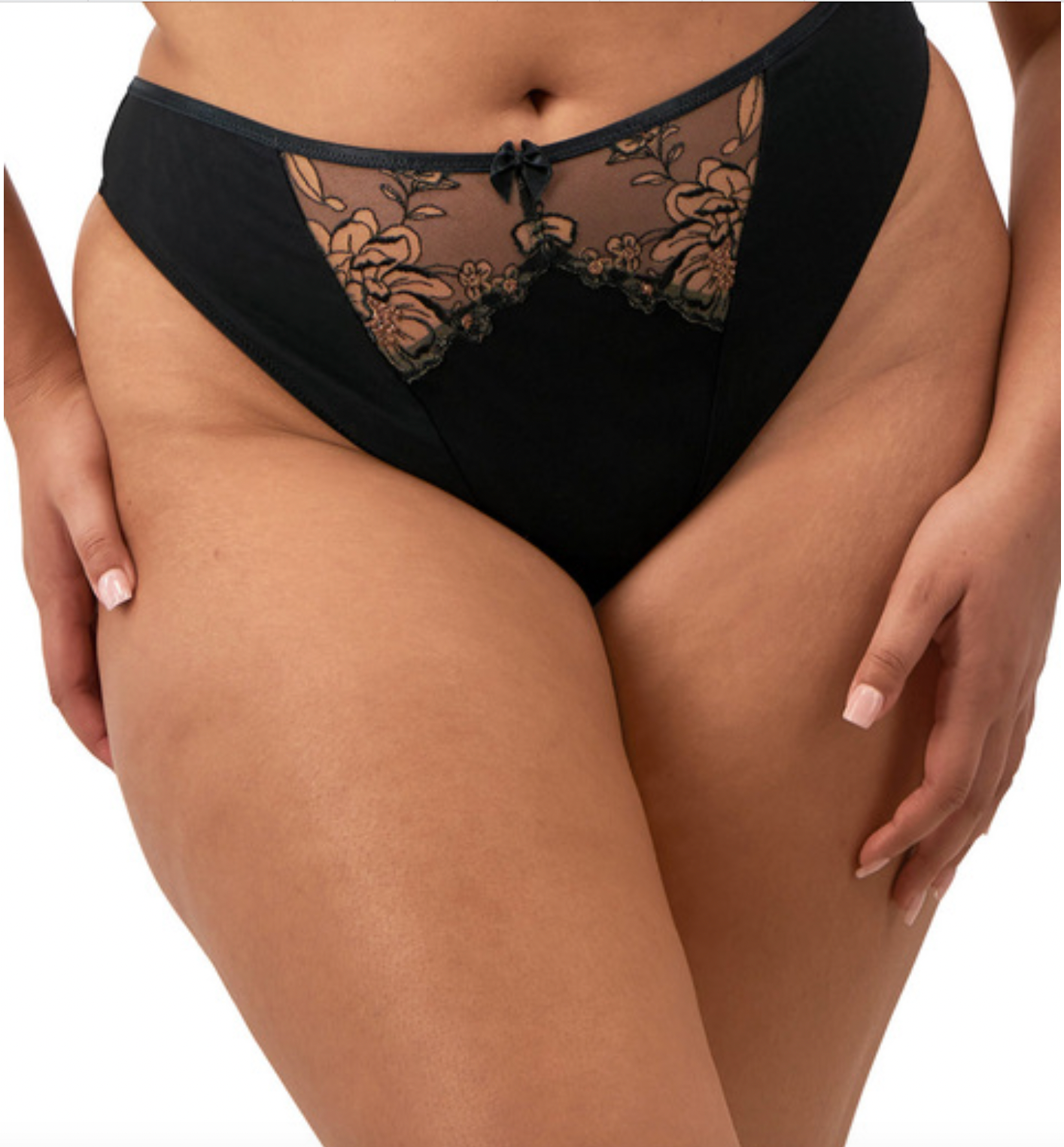Sa dentelle florale noire joue sur la transparence et crée un effet tattoo sublime sur la peau, tandis que sa coupe échancrée allonge la jambe et met les courbes en valeur avec élégance.